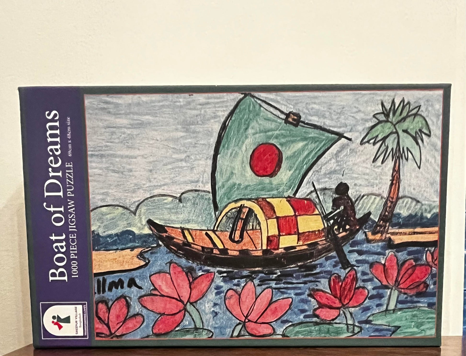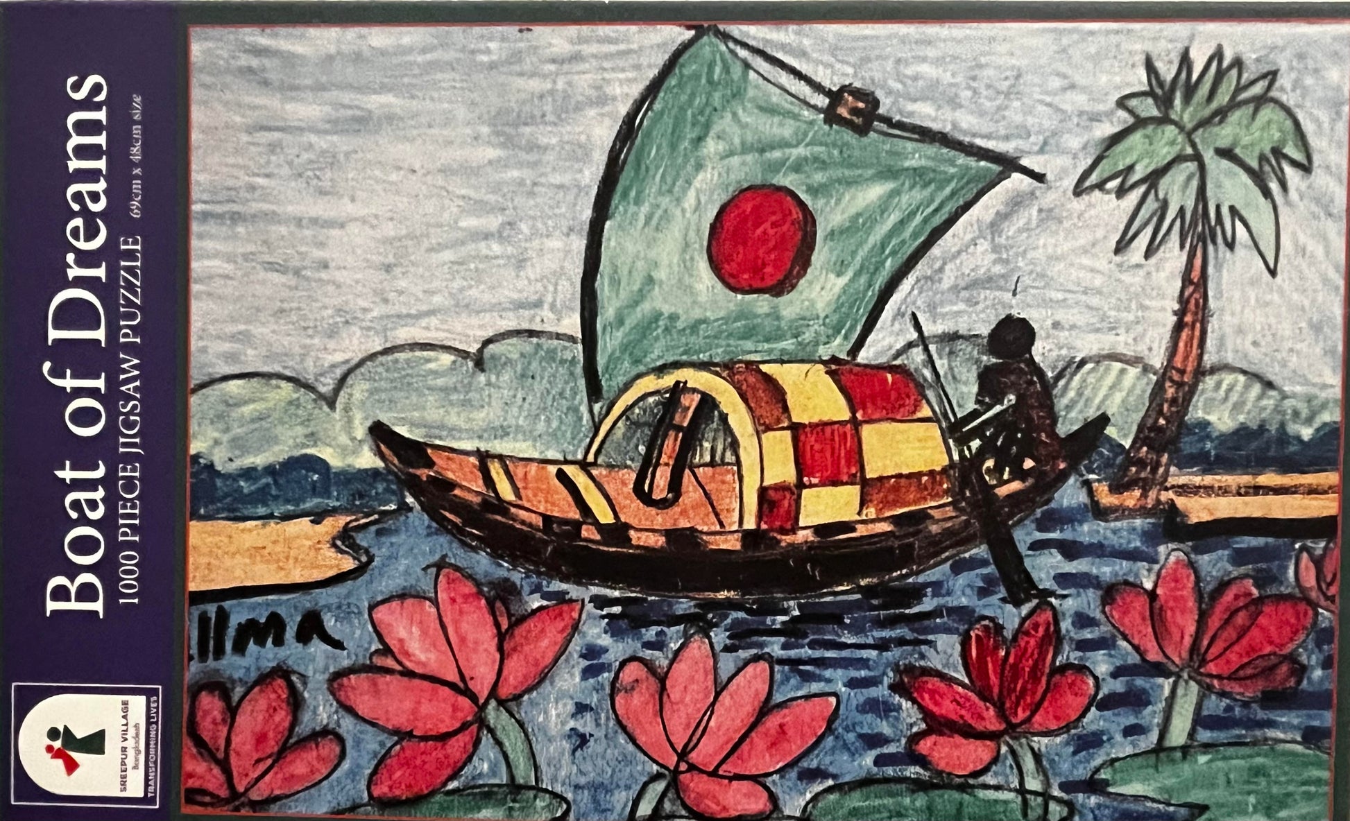 This beautiful puzzle features original artwork created by a child at Sreepur Village in Bangladesh. The vibrant scene shows a traditional river boat sailing through lotus flowers, bringing the artist's imagination to life.